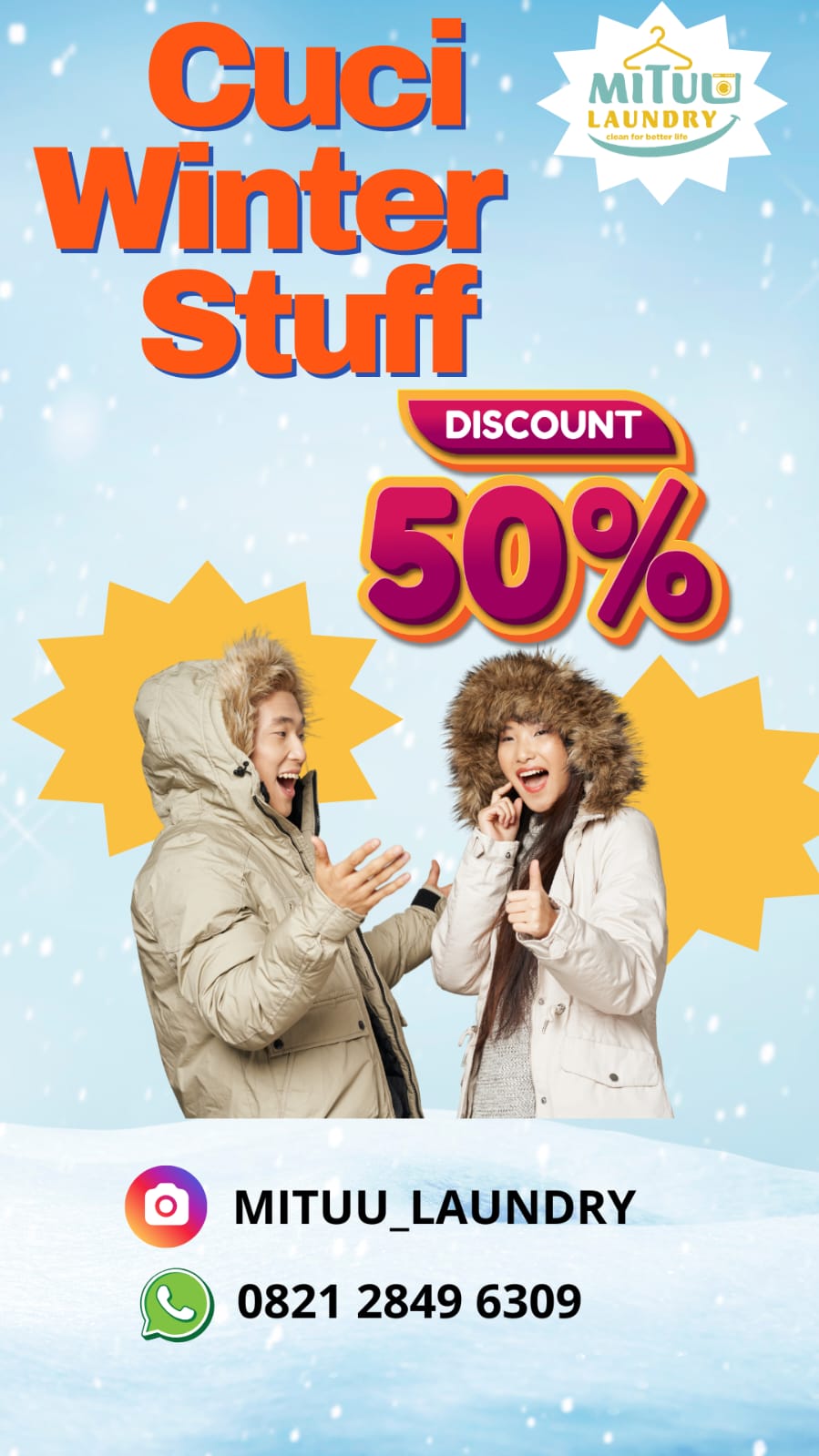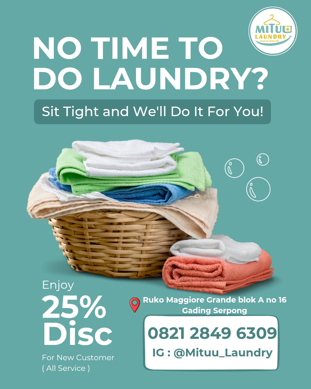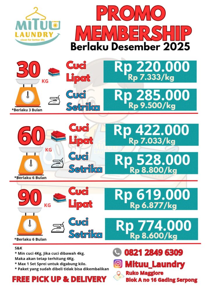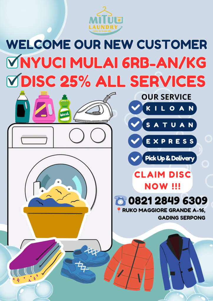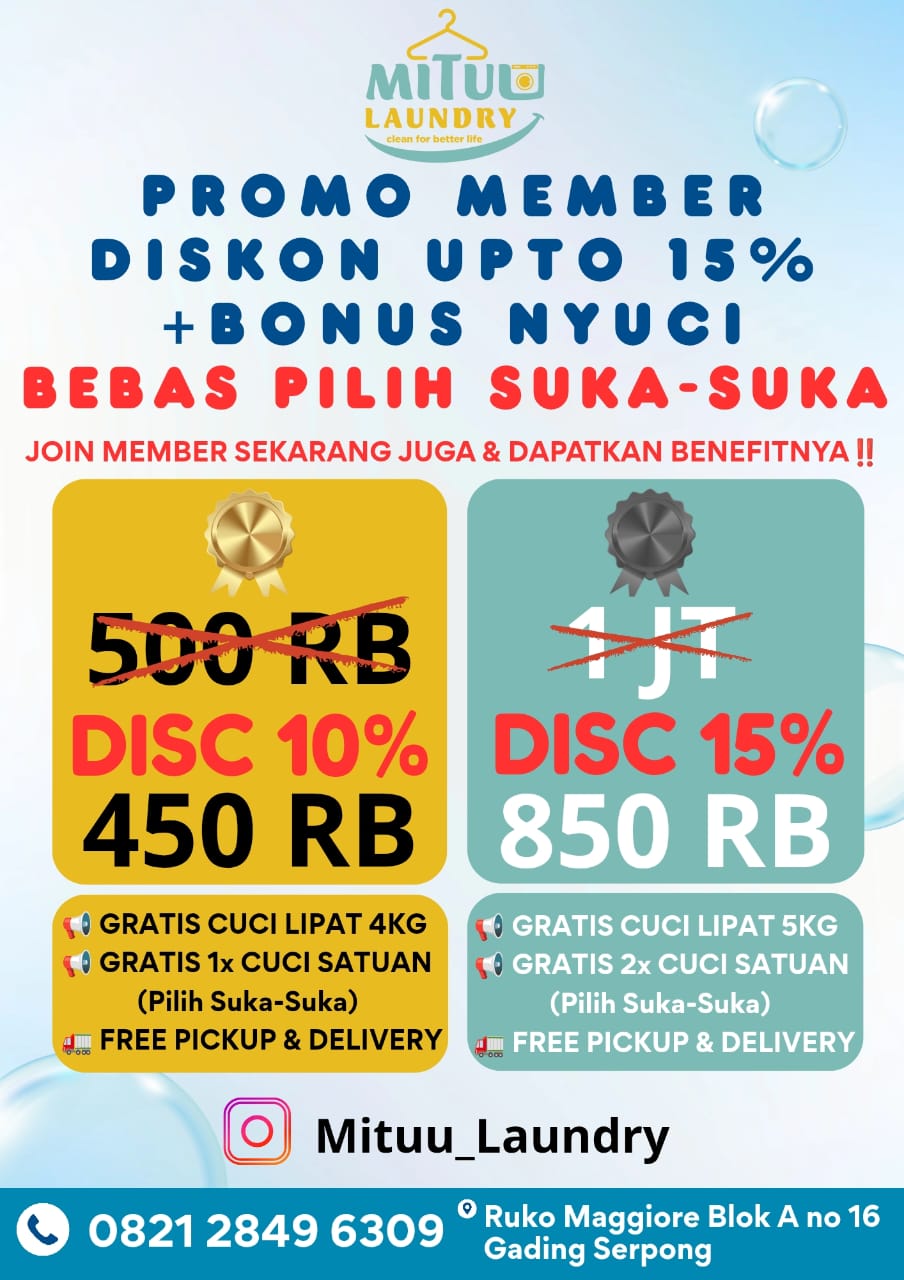 Belum pernah coba Mituu Laundry? Sekarang saat yang tepat! Nikmati diskon 25% khusus pelanggan baru Biar pakaian kamu bersih maksimal dengan harga hemat